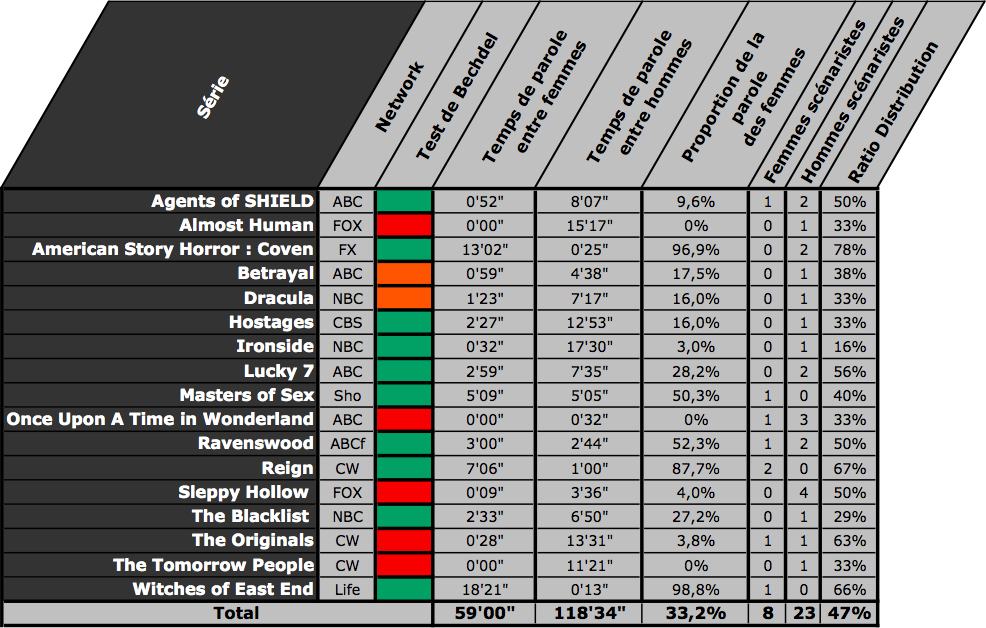 Seuls Masters of Sex et Ravenswood atteignent cet équilibre avec les conversations entre hommes et les conversations entre femmes. (Sleepy Hollow et Once Upon A Time In Wonderland en atteignent un autre puisqu’elles n’ont quasiment pas de conversations autres qu’entre homme et femme !)