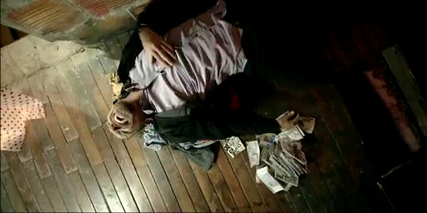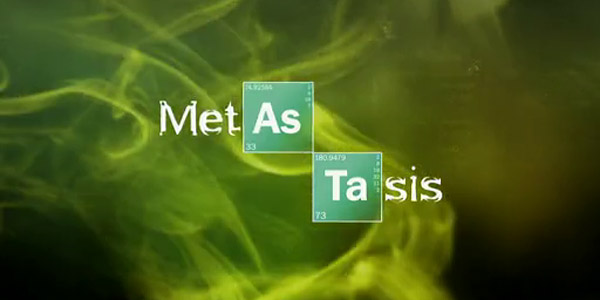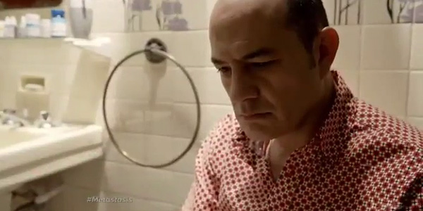 Ici, l’histoire est exactement la même, le sentiment de facilité demeure, sauf que l’emballage fait que tout parait encore plus ridicule. En effet, dans Metástasis, à la fin de chaque séquence, il y a des pubs. Et au début et à la fin de chaque plage publicitaire, il y a un écran titre avec un petit jingle énervant à la guitare :