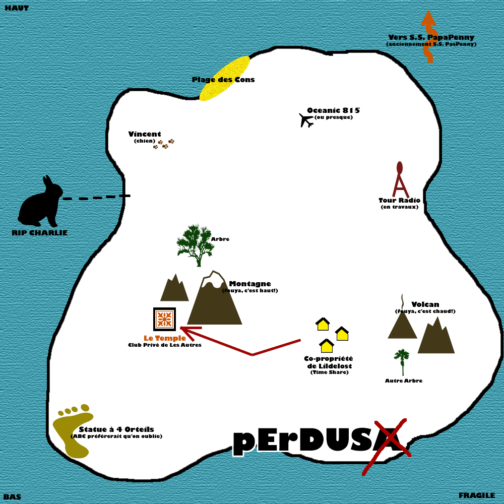 Le seul point positif que j’ai réussi à trouver dans cette intrigue très bancale, c’est que Ben nous ressort une de ses chouettes cartes de Lildelost pour indiquer à sa « famille » le chemin le plus court vers le Temple (une station Dharma, apparemment), où ils seront en sécurité. Et comme sur la carte du final de la saison 3, il n’y a absolument rien dessus, ça ne choque personne, et ça me fait beaucoup rire.