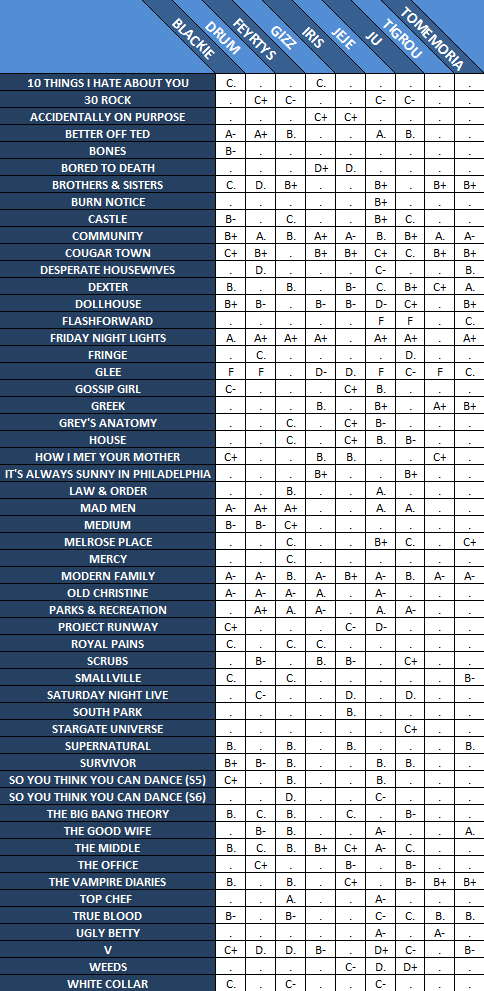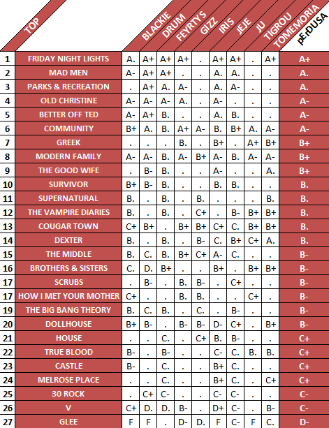 On réunit tous les rédacteurs du site. On leur demande de noter les séries diffusés entre fin mai et fin décembre. On leur fait utiliser une notation avec des lettres et des signes, un peu comme pour les groupes sanguins. On débat pendant des heures, une fois que toutes les listes ont été rendues et compilées (pas avant, c’est important, ça fait partie de la tradition), sur la signification des notes et l’égibilité des séries. "Mais, la moyenne, c’est ’C+’ ou ’C’ ?" "Mais Better off Ted, ça compte ? Les épisodes diffusés en juillet faisaient partie de la saison 1 et il n’y a eu que deux épisodes de la saison 2." On découvre la fonction "vlookup" de son tableur. On fait un classement avec les séries regardées par quatre rédacteurs au minimum. On s’ébahit des compétences de Ju sous Spip qui rend chaque saison les tableaux de plus en plus jolis. On change sa note d’Ugly Betty au dernier moment parce qu’on est celui qui écrit ce texte.