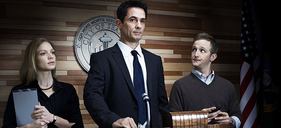 Ceci a une conséquence immédiate : la meilleure façon d ‘appréhender et d’apprécier une série comme The Killing est de se concentrer sur ce qui se passe chaque semaine, pas sur sa conclusion. Mais pour cela, il faudrait que ce qu’on nous propose soit un peu plus convaincant, et un peu mieux écrit. Notre temps est découpé en trois tiers très inégaux : d’un côté une intrigue avec des politiciens caricaturaux et manquant de profondeur, de l’autre avec la famille en deuil (très bien interprétés, bien écrit, mais assez répétitif), et enfin, seulement après ça, l’enquête en elle-même. Et si Holder et Linden sont des protagonistes assez engageants (surtout Holder, car pour Linden ça dépend des semaines), je ne les trouve jamais vraiment très impliqués et motivés à résoudre ce meurtre… et encore moins quand Linden nous rabâche épisode après épisode (et dans l’indifférence générale) qu’elle s’apprête à partir pour la Californie.