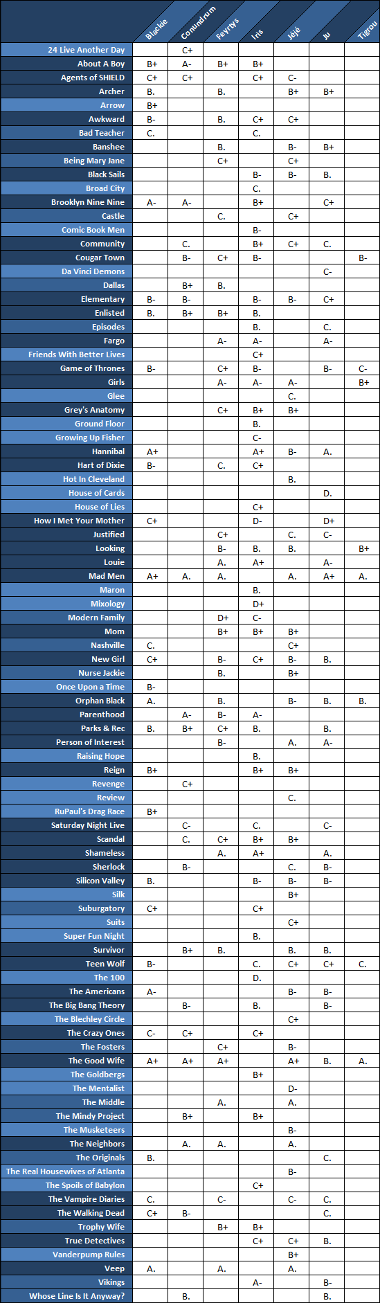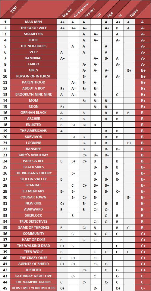 * Mad Men est la seule série notée par plus de 3 rédacteurs à n’obtenir que des A (The Good Wife échoue à cause de Ju, Hannibal à cause de Jéjé, Girls à cause de Tigrou).