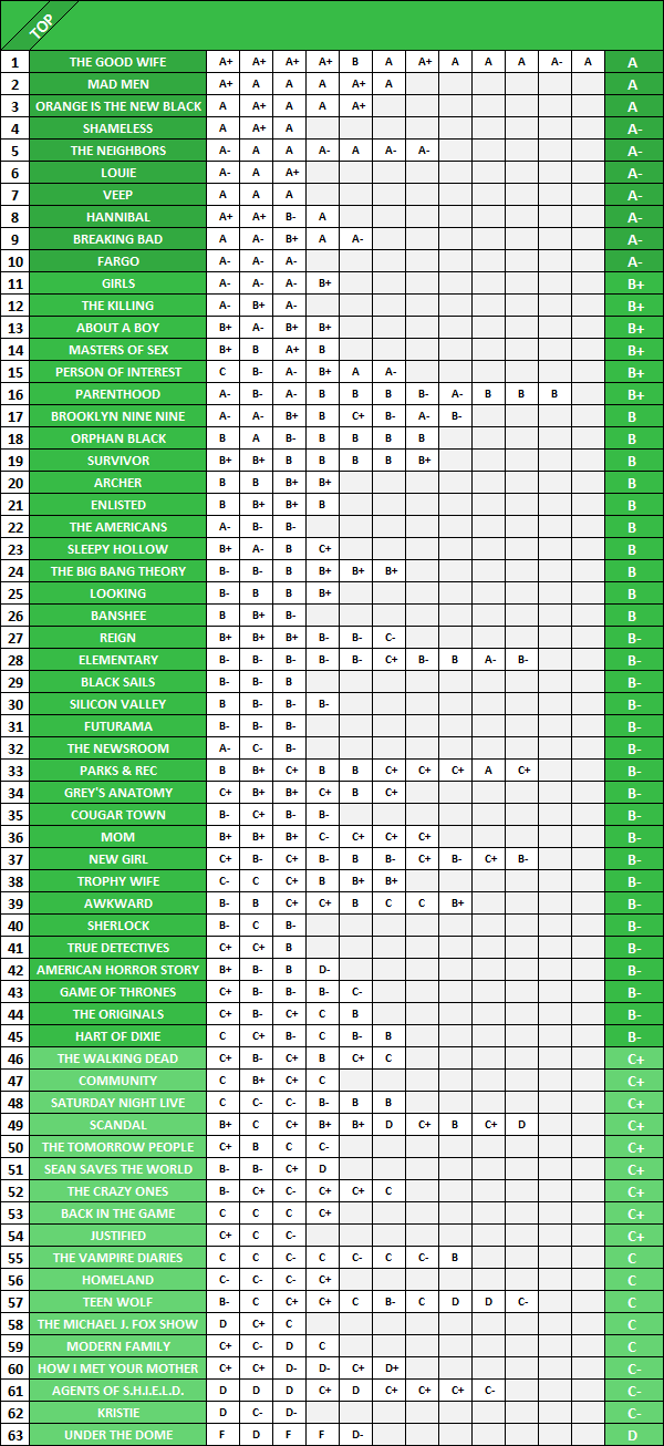 * The Middle et Vikings sont les deux seules séries à avoir obtenu des "A" qui n’apparaissent pas dans le tableau rouge.
