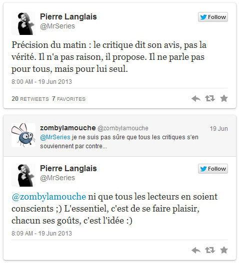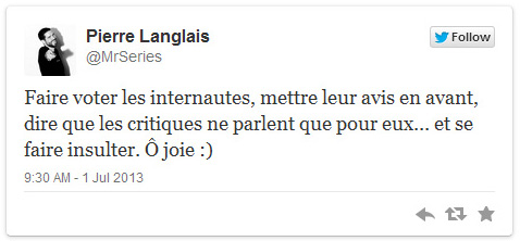 Car quand on y réfléchit deux minutes, une grande partie du métier de Pierre Langlais est critique de séries. Son boulot, le boulot pour lequel il est payé, c’est de donner son avis sur ce qu’il regarde. Son job, c’est d’avoir une vision « supérieure » des fictions télévisées (ou, disons, une vision « professionnelle ») qui lui permet de fournir des opinions informées et réfléchies à ses lecteurs.