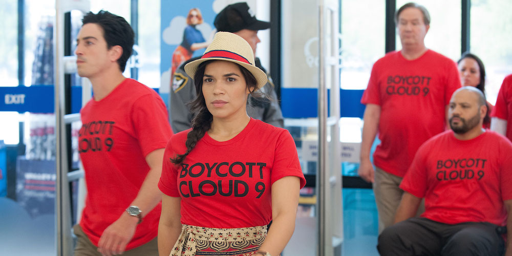 Superstore fait partie de ces petites gemmes qui n’ont l’air de rien au premier abord et dont on se détourne trop rapidement parce que le thème ou le titre peut paraître intéressant. Mais ça serait une erreur de s’arrêter à ça. Qui plus est, l’air de rien, Superstore pointe (avec un certain angélisme parfois mais toujours avec humour) des sujets graves et malheureusement encore d’actualité sur les conditions de travail des salarié·es dans ce genre d’entreprises : l’absence de congé maternité, d’assurance maladie ou d’heures supplémentaires rémunérées, les pauses pipi réglementées et pauses repas limitées à 15 minutes (sous la surveillance et le chronomètre de Dina), le travail des sans-papiers, les inepties et incohérences administratives des grandes structures...
