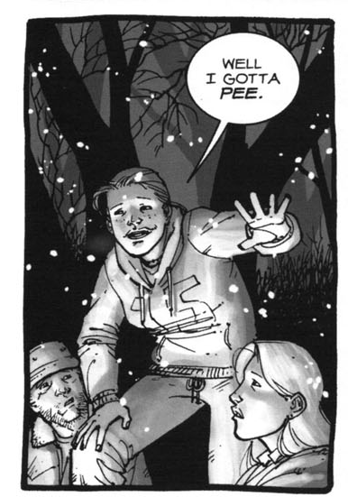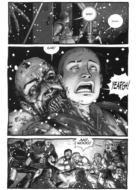 Plus grave encore : visuellement, la série semble ramer pour mettre en mouvement le comic. Ca se voit particulièrement dans cette scène où le camp est attaqué par des zombies. Alors qu’elle fonctionnait très bien sur le papier, elle m’a semblée ratée à l’écran : la pauvre Amy donne l’impression d’arrêter de bouger, pour bien laisser le temps au zombie de lui mordre le bras ; alors qu’elle n’est qu’à quelques mètres d’eux, les autres personnages réagissent avec une lenteur étonnante pour permettre aux morts-vivants de l’achever avant leur intervention…