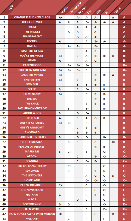 — Faking It, Last Week With John Oliver et The Legend of Korra n’ont que des "A" mais n’apparaissent pas dans le tableau rouge.
