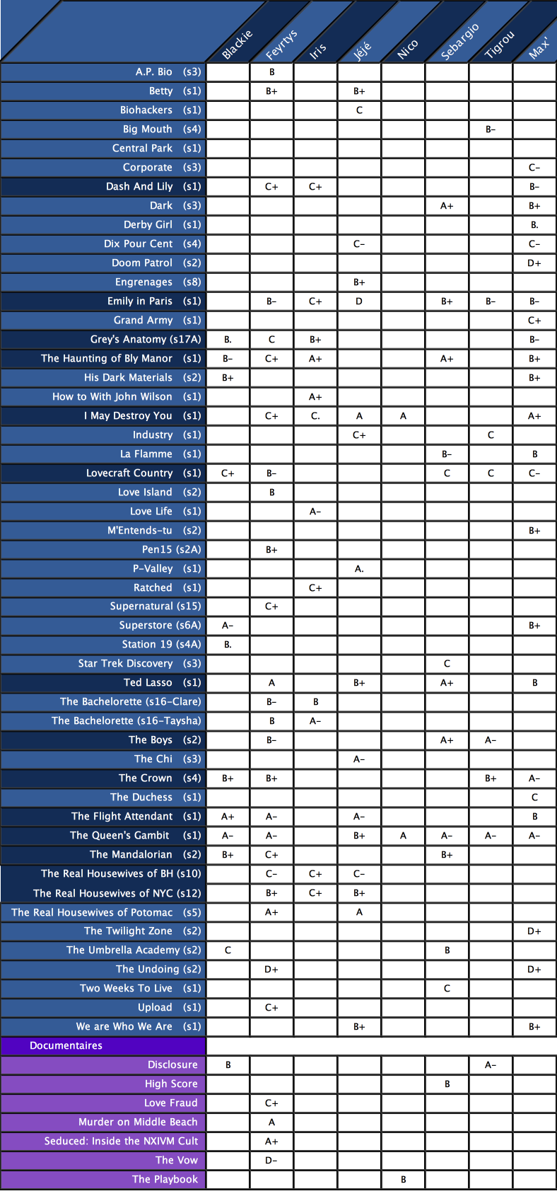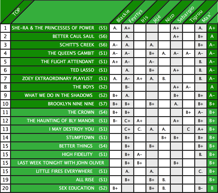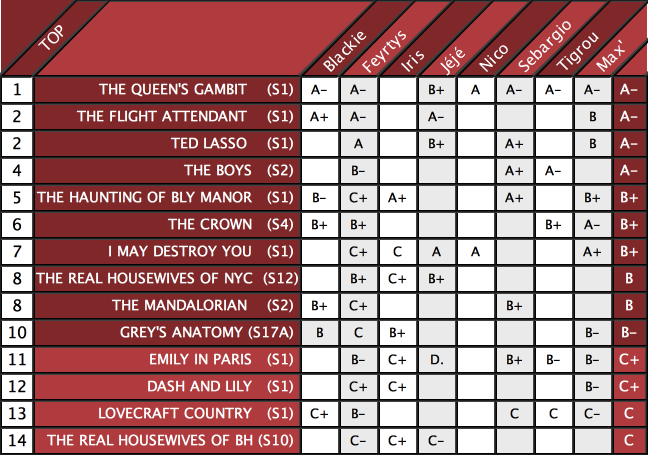 (Pas de panique, à la suite de ce tableau, vous trouverez nos joyaux dissimulés du tableau bleu, un TOP 10 alternatif des séries/programmes qui n’ont donc été vu·es que par un·e seule d’entre nous...
