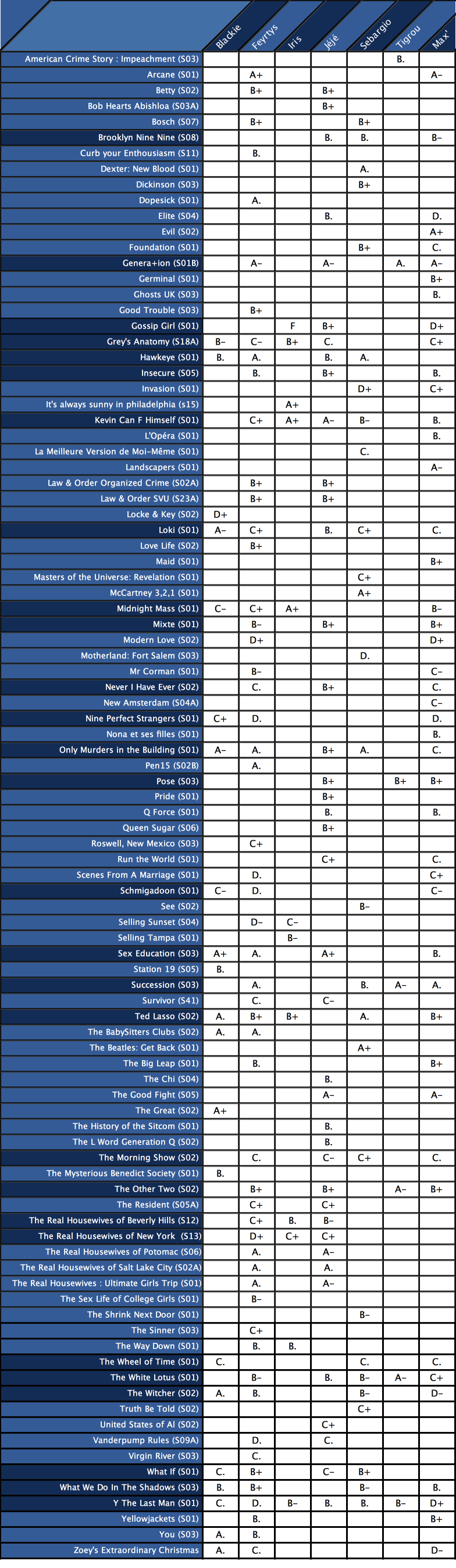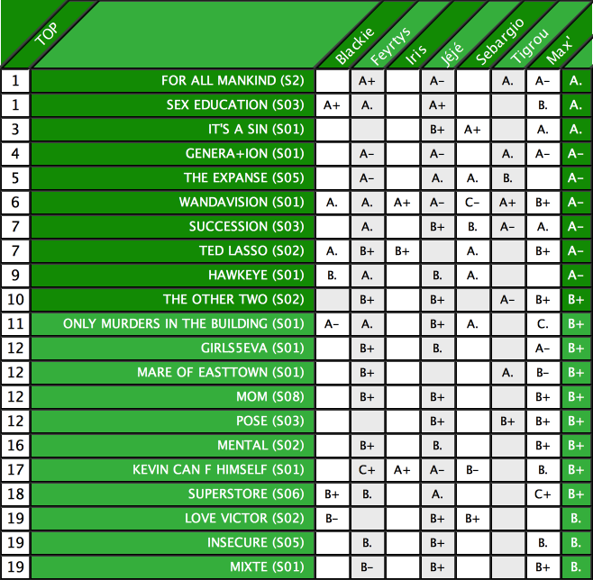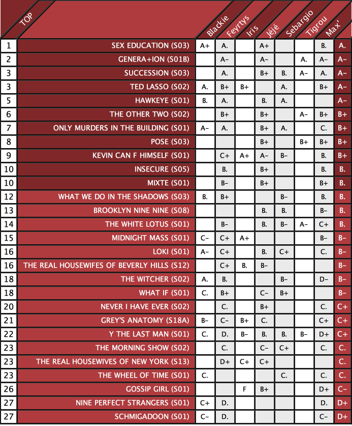Ce qui nous a rassemblé ce semestre, c’est donc la jeunesse anglo-américaine intersectionnelle et les hommes cis blancs hétéros de plus de 40 ans (oui, oui, Ken, Ted et Clint, on adore, Logan, Charles, Oliver, on aime aussi..).