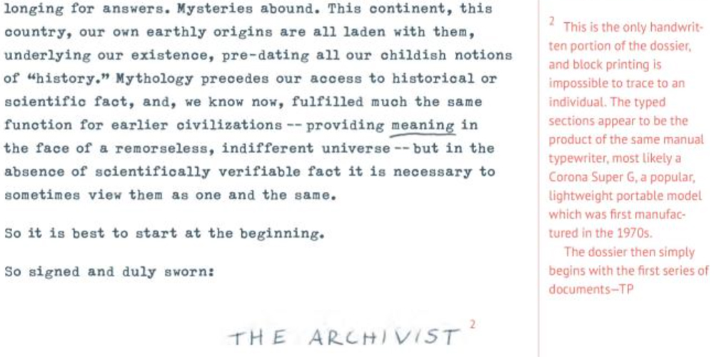 Cette histoire compilée par l’Archiviste jusqu’à un moment bien précis est annotée, de nos jours, par un agent du F.B.I.. Frost joue ainsi sur la temporalité en apportant alors trois axes de lecture.