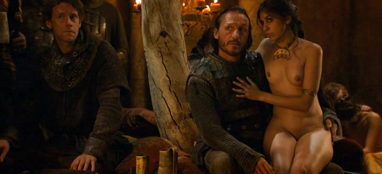 Cette scène, dans laquelle Bron et ses hommes passent le temps en buvant et en se "tapant de la servante" en attendant l’assaut sur King’s Landing, illustre le rapport complètement infantile que la série entretient avec la sexualité en la réduisant à une simple exhibition de nudité féminine pour le plaisir des hommes.