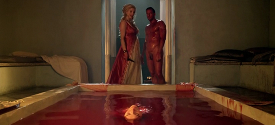 Glabus vient d’échapper à la mort dans le bassin en retournant contre elle l’arme que sa maîtresse avait l’intention d’utliiser. Ilithya, sa femme, alertée par le bruit des cris, découvre la scène et prend conscience que son pouvoir est restauré au sein de son couple… Le sexe, la mort, le pouvoir, en une seule scène !