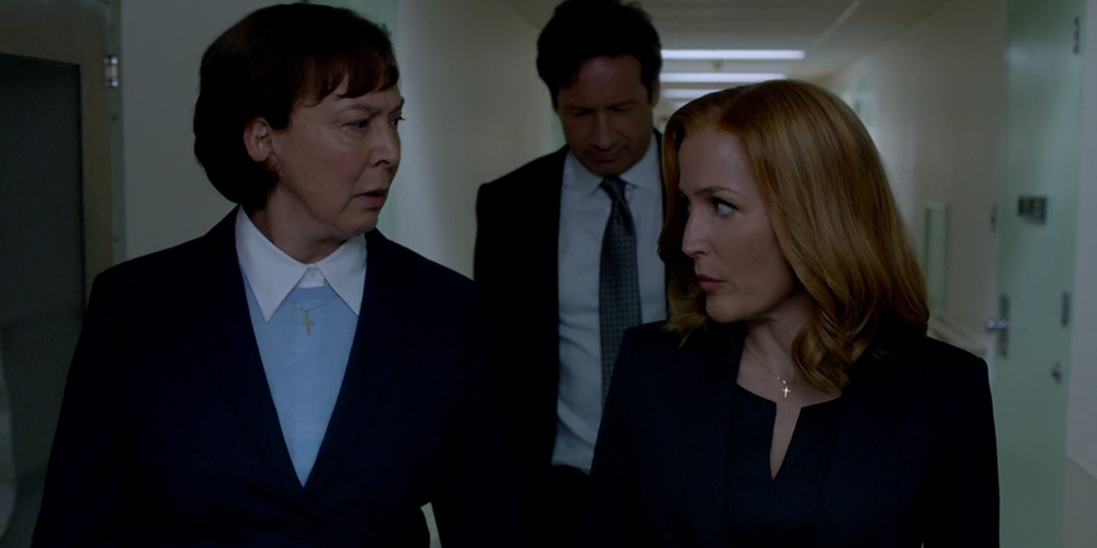 Choisir d’aborder l’abandon de William via un épisode indépendant est une bien meilleure idée qu’en faire partie intégrante de la mythologie. Il est bien plus tragique et réaliste de ne pas montrer William dans sa nouvelle vie. Cela permet aussi à Gillian Anderson de faire autre chose que de suivre Mulder. Pour une fois, il a un rôle plus passif [1], et marche même derrière elle dans la scène où ils interrogent une nonne. Ce n’est peut-être pas grand-chose mais quand on se rappelle des interviews d’Anderson où elle expliquait que dans les premiers épisodes, elle devait marcher derrière Mulder, on ne peut s’empêcher de sourire devant son écran.